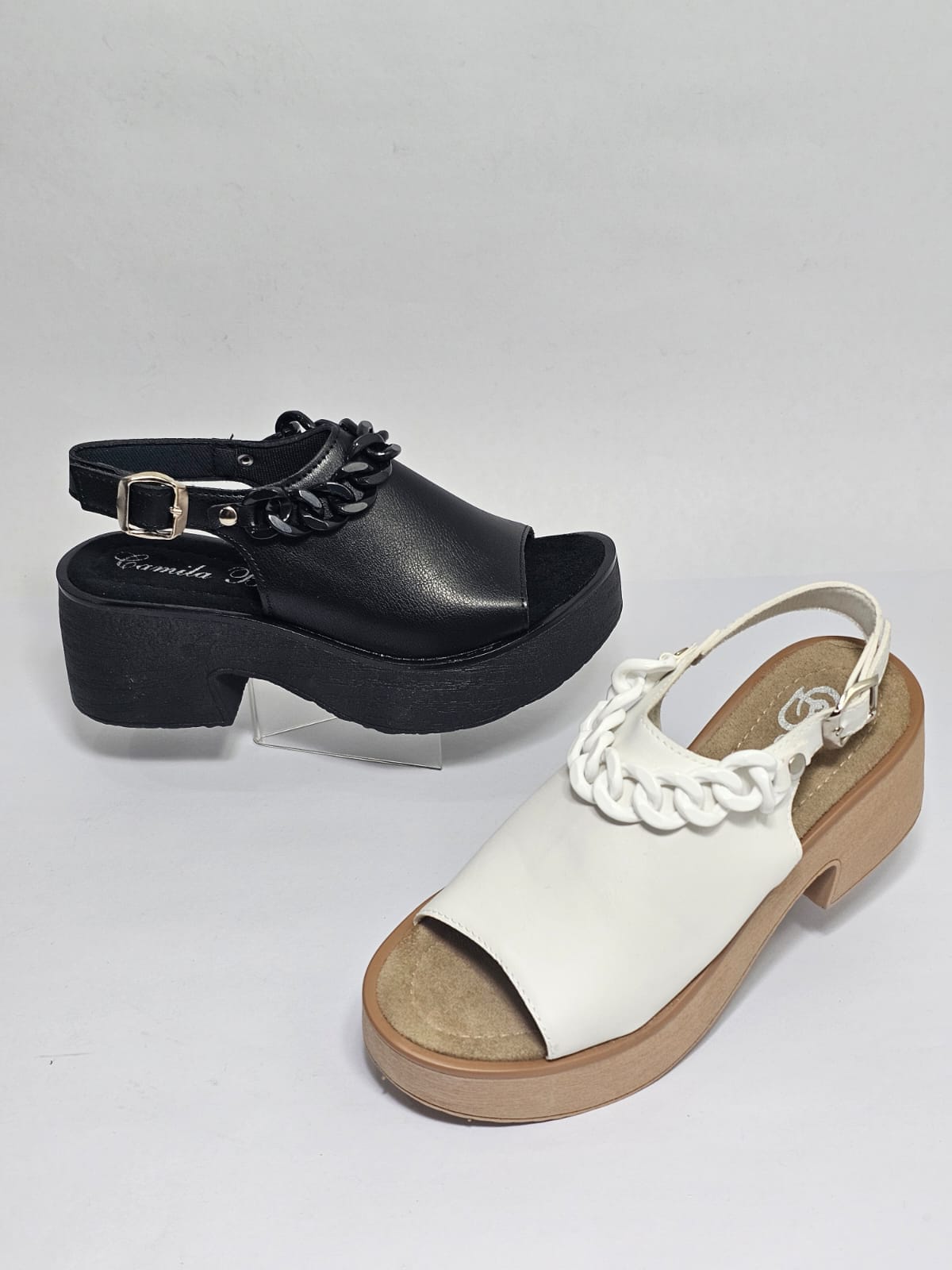 Sandalia con cadena y hebilla en el talón.